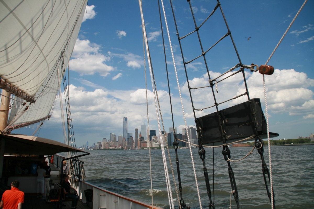 Am Battery Park sind wir dann ausgestiegen. Segeln stand auf dem Programm. Wir lieben Segeln, daher konnten wir uns die Tour mit dem Segler „Clipper City“ doch nicht entgehen lassen. Zumal sie doch eh schon bezahlt war, dem New York Pass sei Dank. Und wir hatten tollstes Segelwetter. Alle Segel gesetzt und ohne motorische Unterstützung rauschten wir dahin. Unsere Mägen hatten damit ja keine Probleme. Aber der ein oder andere war doch leicht grün im Gesicht. Vielleicht hätte man den Landratten doch davon abraten sollen, die Toiletten unter Deck aufzusuchen.