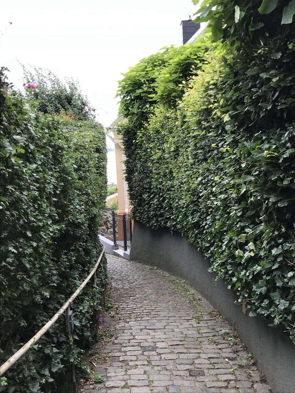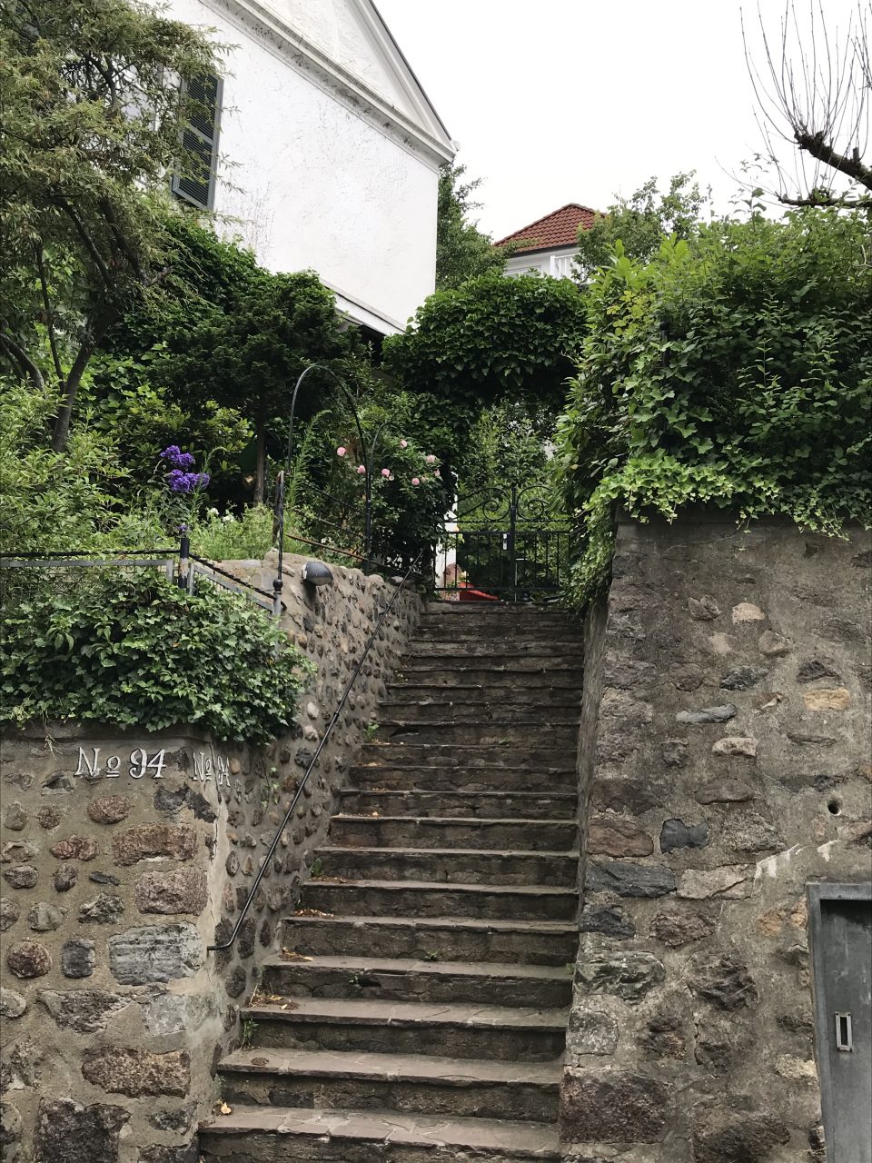 Nach ein paar Metern auf der Hauptstraße geht’s dann links ab in Richtung Treppenviertel. Ziel ist die erste Treppe Steiler Weg. Dafür müsst Ihr dann erst mal in Richtung Hessepark laufen und dann über die Straße Am Kiekeberg weiter bis zum Anfang der ersten Treppe. Der Hessepark ist eine gepflegte Grünfläche mit einem Landhaus, das mittlerweile unter Denkmalschutz steht und nicht öffentlich zu besichtigen ist. Am Kiekeberg ist übrigens wirklich zum Kieken. Die Häuser sind extrem in den Hang gebaut; das schaut manchmal schon abenteuerlich aus. Das würde mich ja mal im Winter bei Schnee interessieren. Aber bei Schnee braucht man im kompletten Treppenviertel Spikes.
